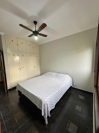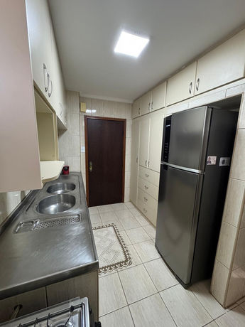 Com 2 dormitórios, 2 banheiros, área de serviço, quarto de empregada, uma vaga de garagem, com 100 metros quadrados de área construída. Condomínio barato, andar alto.